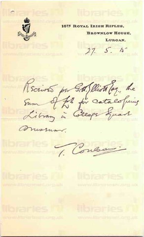 Received per G.H. Elliott Esq. the sum of £3 for cataloguing Library in College Square