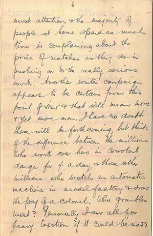 I see from the newspapers that the usual inane topics are occupying most attention & the majority of people at home spend as much time in complaining about the price of watches as they do in pushing on to the really serious work. Another winter campaign appears to be certain from this point of view & that will mean more & yet more men. I have no doubt these will be forthcoming, but think of the difference between the millions who work over here in constant danger for a day & those other millions who watch an automatic machine in a model factory & draw the pay of a colonel. Who grumbles most? Personally I am all for heavy taxation if it could be made to fall on those who are benefitting so much from the war, but unfortunately the burden of taxation always falls on the professional man who is without a friend outside of his own class. Discipline & control has done wonders to our soldiers & has assisted in levelling barriers so I hope that when we all return to our normal existence those old feuds will be forgotten & we can deal honestly & effectively with the lawyers who misgovern us. I would like you to hear some of the things said in conversations among the men. Really one gets to know men very well in the army, & all the good that this war has not done has not been limited to the men. We who command have learned too & the well to do young men who are going to rule the country in later years are learning a lesson which ought to make us a nation to be reckoned with again.