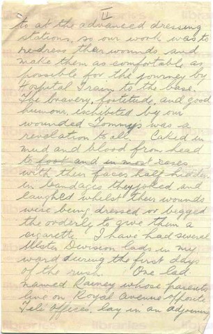 Please accept my sincere apology for not writing sooner, but since returning from leave I have been kept very busy owing to this great Allied Offensive. This afternoon I am off duty so intend devoting my time in writing to my friends. When the first blows of the great offensive were struck our station was almost submerged with British and German casualties but the work was carried on night and day for the first few days. Great order prevailed the whole time and the work was carried out very methodically. Practically all the wounded we received had been attended to at the advanced dressing stations, so our work was to re-dress the wounds and make them as comfortable as possible for the journey by Hospital Train to the base. The bravery, fortitude, and good humour exhibited by our wounded Tommys was a revelation to all. Caked in mud and blood from head to foot and in most cases with their faces half hidden in bandages they joked and laughed whilst their wounds were being dressed or begged the orderly to give them a cigarette. I have had several Ulster Division lads on my ward during the first days of the rush. One lad named Rainey164 whose parents live on Royal Avenue opposite Tele offices lay in an adjoining ward. His right arm was missing and several fingers of his left hand also. I had a long conversation with him and he was looking forward to going back to "old Belfast". The next evening he died very peacefully. His death was due to shock. On the whole I think it was happy for him as he was very cruelly crippled. Of the great numbers that passed through our hands we had a remarkably small percentage of deaths. Gen. Sir D. Haig specially commended the Medical Service in his despatch, and I think they deserved it too. I believe before very long we shall have the Germans suing for peace, if guns and men are any encouragement. I hope sir, your health is keeping good, also all the staff and that Capt. Simpson165 and Warren are again fit and well. I enclose the photo as promised.