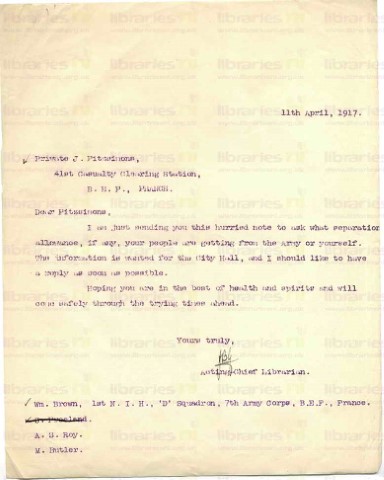 I am just sending you this hurried note to ask what separation allowance, if any, your people are getting from the Army or yourself. The information is wanted for the City Hall, and I should like to have a reply as soon as possible.