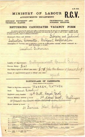 Employer's Name and Address: Library and Technical Instruction Committee, Belfast Corporation