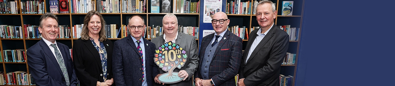 Photo: Dr Jim O’Hagan, Chief Executive Libraries NI, Ms Bonnie Anley, Chairperson Libraries NI, Mr Mark Adair BBC NI’s Head of Corporate and Community Affairs, Mr Stephen Nolan BBC NI Broadcaster and Journalist, Mr John D'Arcy, Director of The Open University in Ireland and Mr Richard Pengelley, Chief Executive, Education Authority.